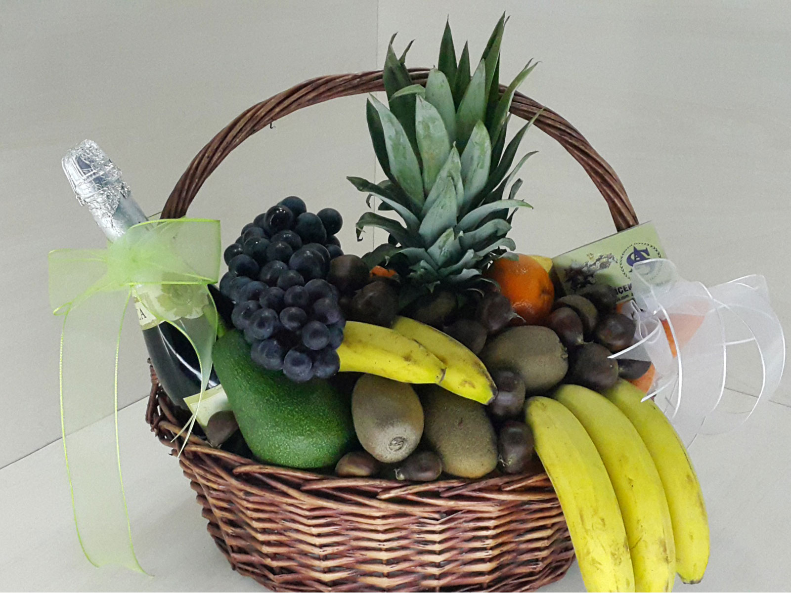 Sepet içerisine mevsim meyveleri, kırmızı şarap (Ağzının tadını bilenlerin paketi)