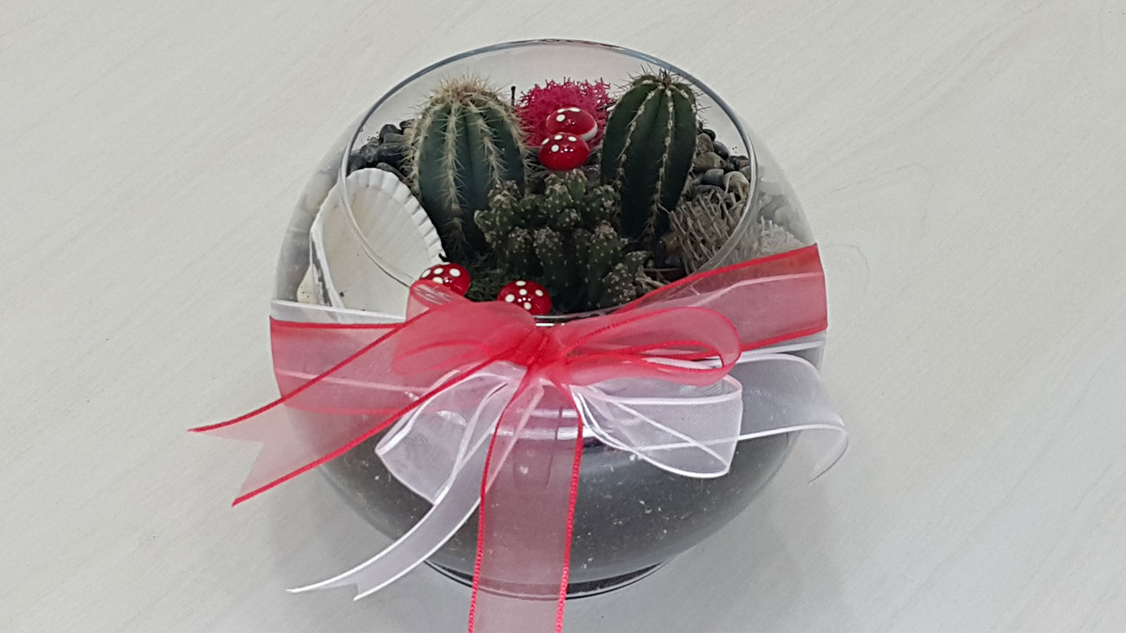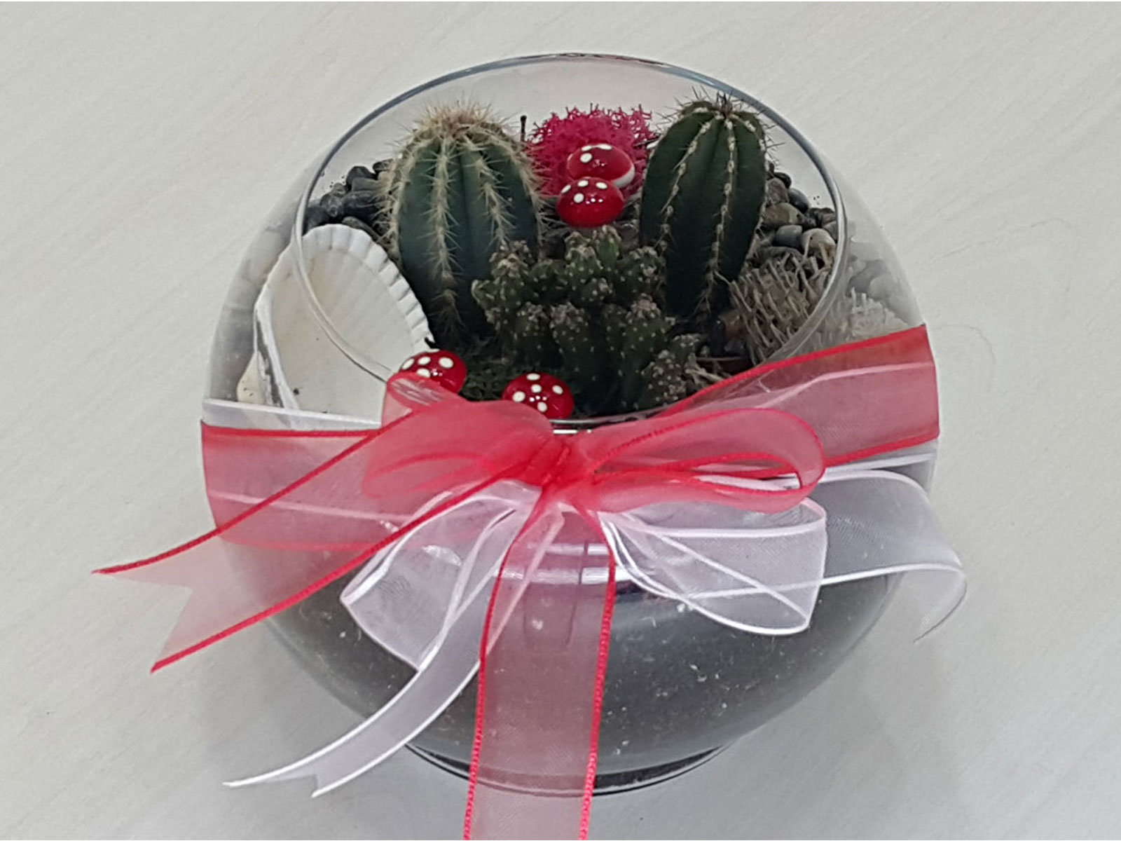 Cam Fanus İçerisin 3 Adet Kaktüs, Değişik Objelerle Hazırlanmış Şık Bir Terrarium Aranjmanı