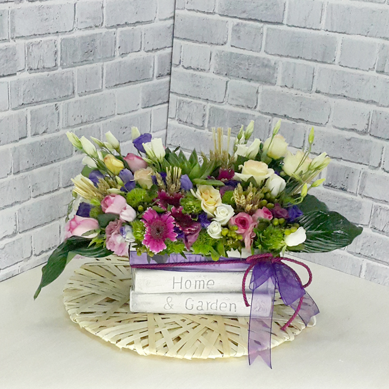 Kitap şeklinde seramik saksıda güller , mevsim çiçeklerinin yeşillikler ve sukkulent ile şık ve zarif çiçek tasarımı.